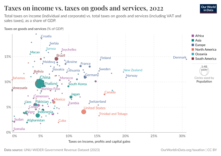 The next visualization plots total revenue from taxes on income and profits (horizontal axis) against revenue from taxes on goods and services (vertical axis), both expressed as a share of GDP.