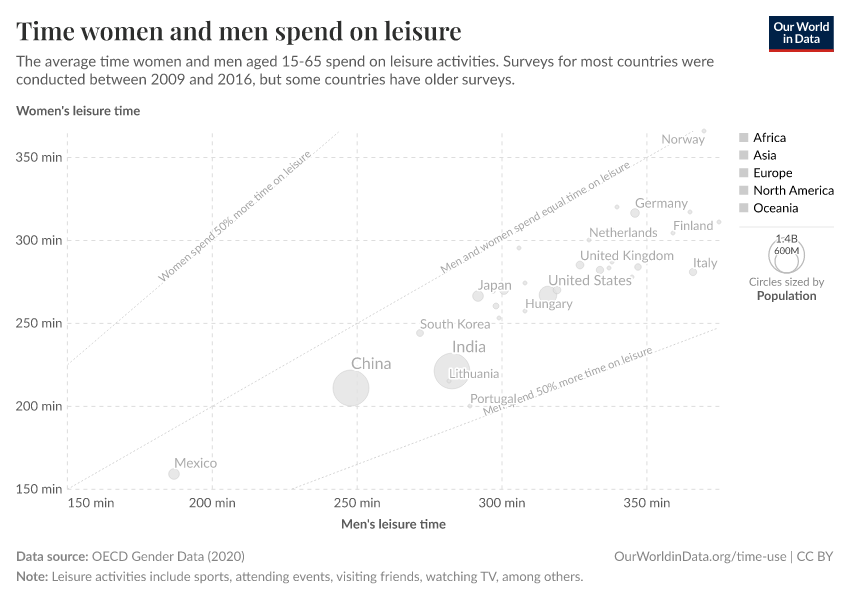 As we can see, in all countries the average leisure time for men is higher than for women — all bubbles are below the diagonal line — but in some countries, the gaps are much larger. In Norway, the difference is very small, while in Portugal men report much more leisure time than women.