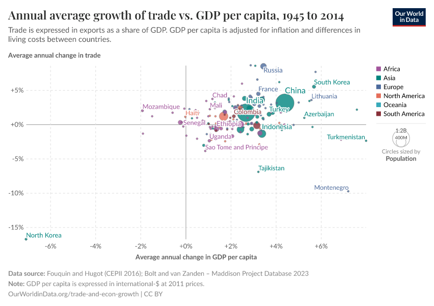 In a similar way, if we look at country-level data from the last half century we find that there is also a correlation between economic growth and trade: countries with higher rates of GDP growth also tend to have higher rates of growth in trade as a share of output. This basic correlation is shown in the chart here, where we plot the average annual change in real GDP per capita, against growth in trade (average annual change in value of exports as a share of GDP).11