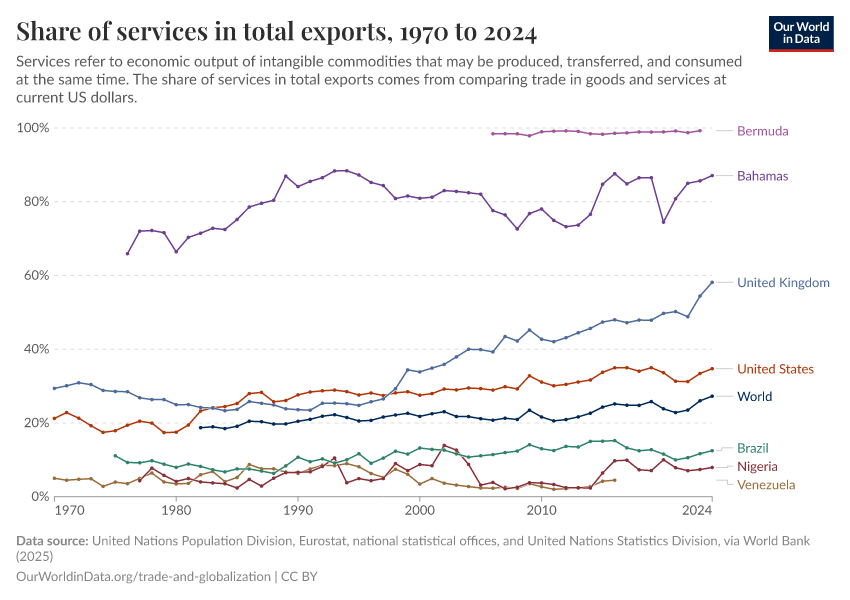 In some countries services are today an important driver of trade: in the UK services account for around half of all exports; and in the Bahamas, almost all exports are services.