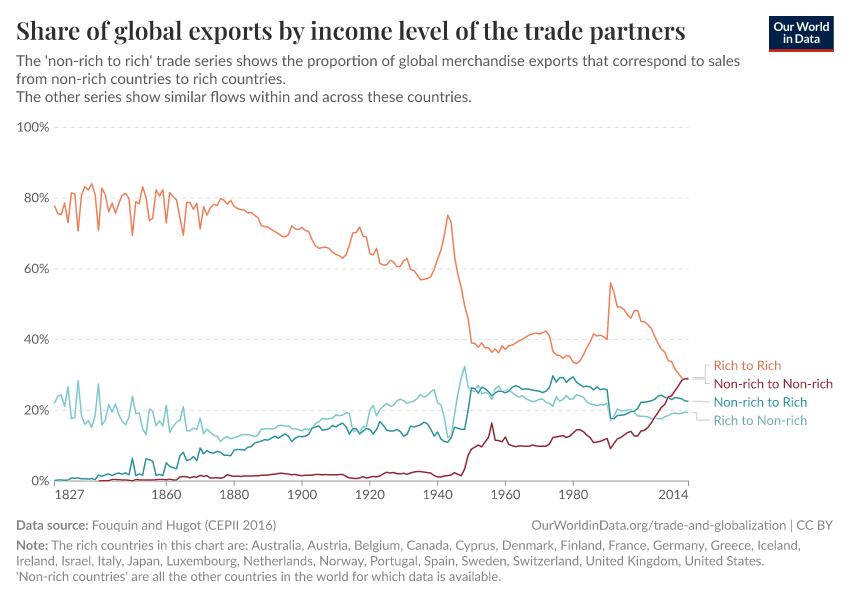 As we can see, up until the Second World War, the majority of trade transactions involved exchanges between this small group of rich countries. But this has changed quickly over the last couple of decades, and today, trade between non-rich countries is just as important as trade between rich countries.