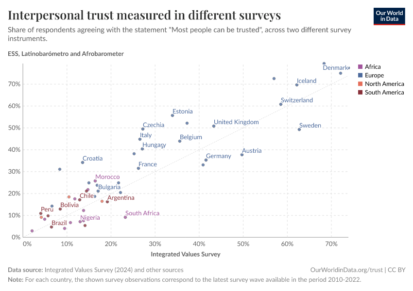 Esteban Ortiz-Ospina, Max Roser, and Pablo Arriagada (2016) - “Trust” Published online at OurWorldinData.org. Retrieved from: 'https://auto-epoch.owid.pages.dev/trust' [Online Resource]BibTeX citation