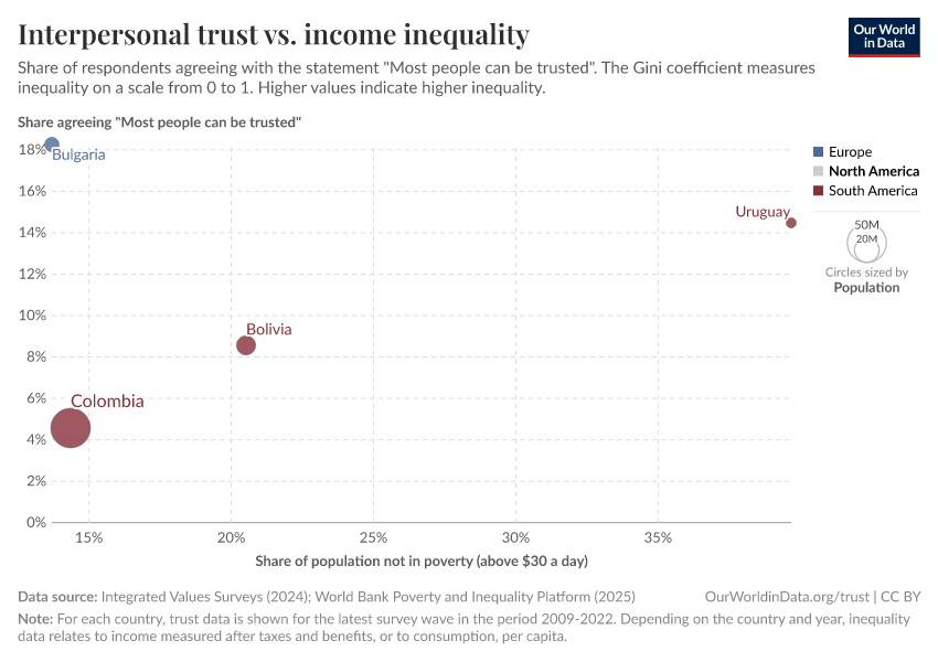 Each dot on this scatter-plot corresponds to a different country, with colors representing different world regions and dot sizes representing the size of the population. A Gini index of 0 would represent perfect equality, so the observed negative correlation in this graph shows that higher inequality is associated with lower trust.