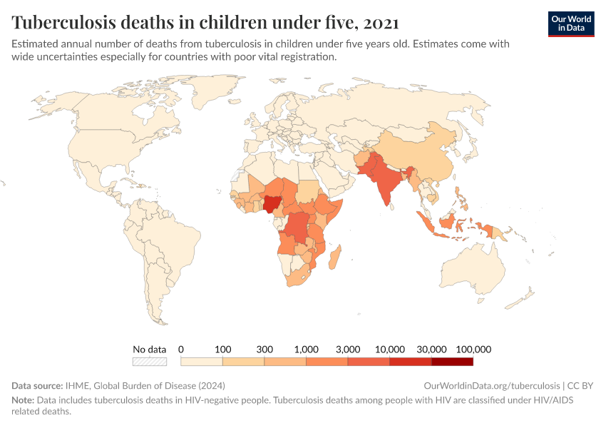 Typically, in international statistics, “tuberculosis deaths” refers to deaths in HIV-negative people, while tuberculosis deaths among people with HIV are classified under “HIV/AIDS related deaths”.