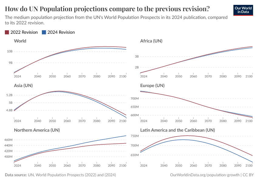 Not every country has seen a drop in projected population compared to the last edition. The chart below shows the differences between the two UN revisions, region by region. Note that the vertical axis scale for each region is different, allowing you to see the changes more clearly.