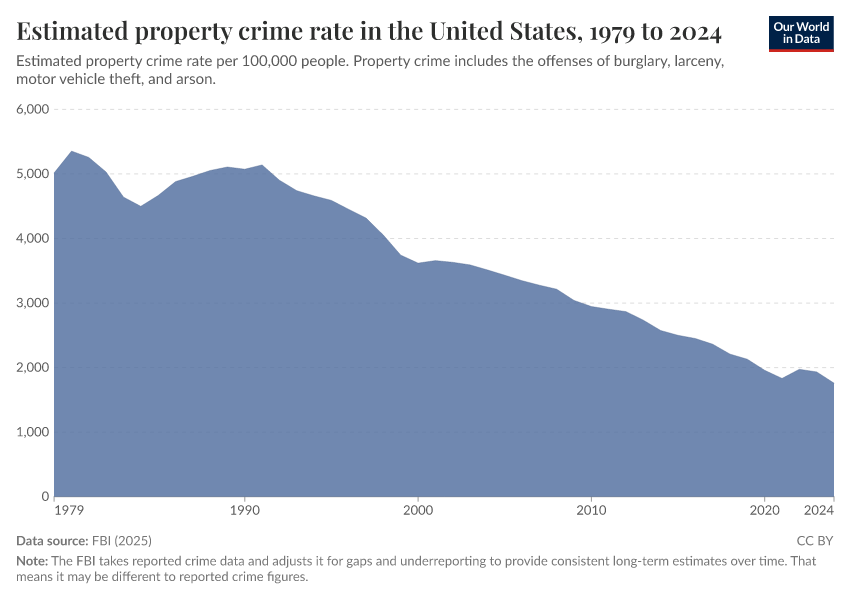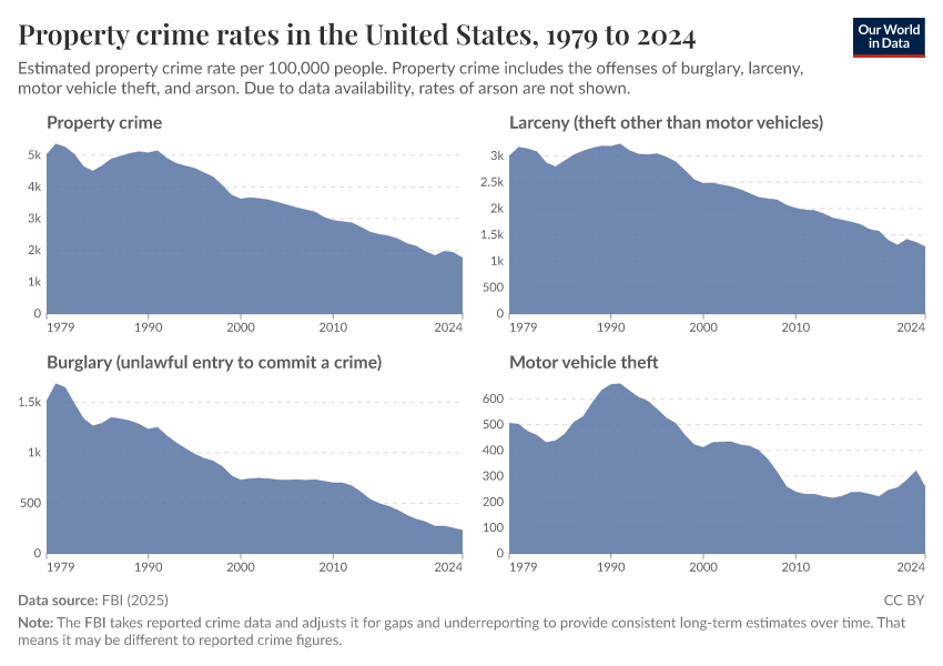 Both violent and property crime are far below their 1990s peak, but some crimes see periodic rises.