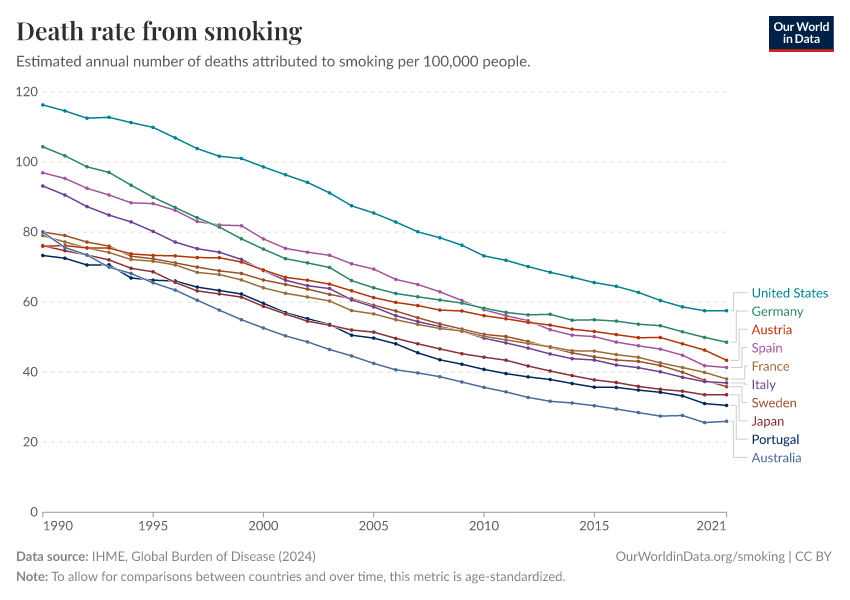 Smoking was extremely common in today’s rich countries between 1950 and 2000 as the chart below shows. Smoking was more widespread in the US than in Europe or Japan. As a consequence Americans died at higher rates from the consequences of smoking as the second chart shows (most of these people died from lung cancer).