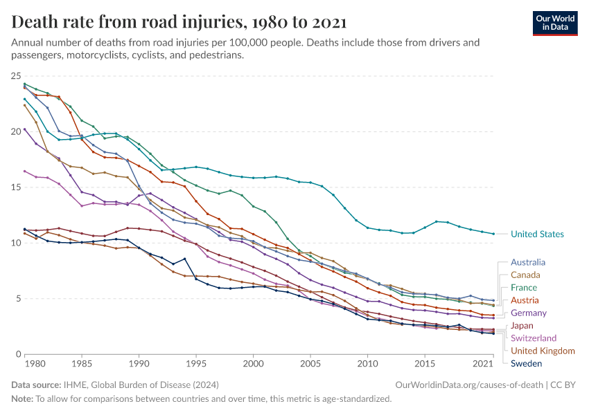 Deaths in road accidents are also much more common in the US than in most other rich countries.