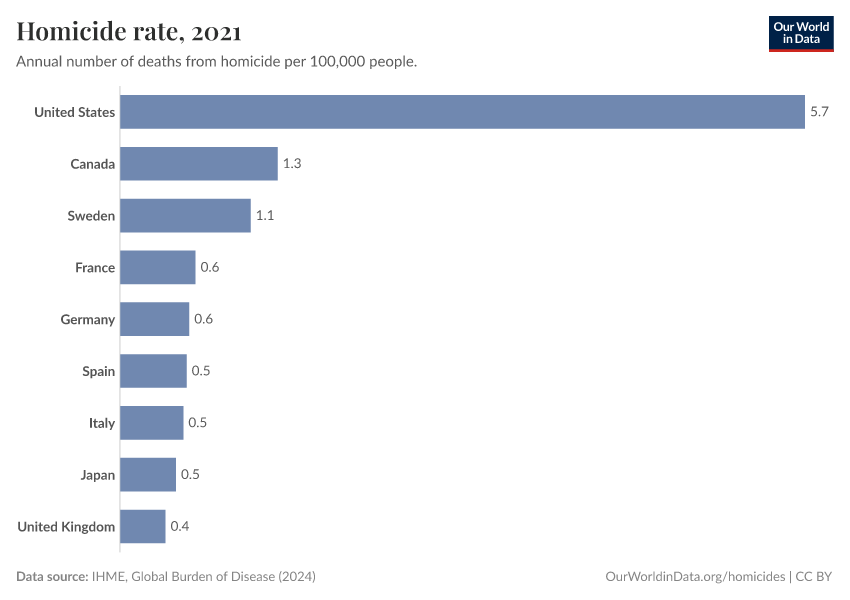 This chart compares homicide rates in the US with a number of other rich countries. No matter which other rich country you add to the chart, you won’t find one with a higher homicide rate. The homicide rate in the US is much higher than in other rich countries.