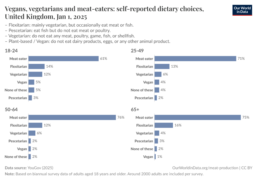 If we want to know about this variation we can rely on survey data on how people describe their dietary preferences. There is, unfortunately, a lack of long-term data on this. But we can look at recent developments.