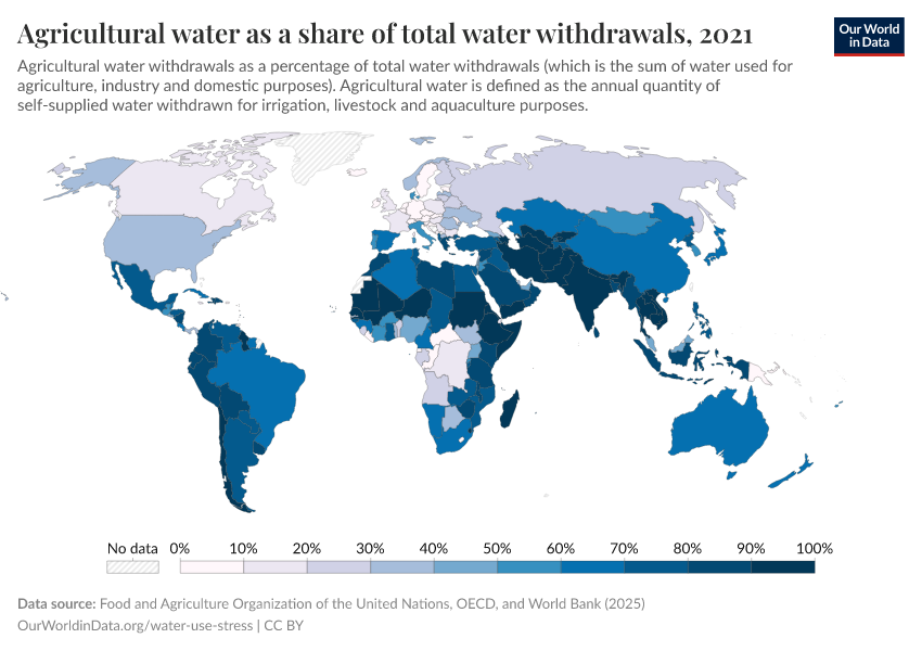 Water is an essential input to global agriculture, whether in the form of rainfed sources or pumped irrigation. The visualization shows the total quantity of freshwater withdrawals that are used in agriculture, whether in the form of food crops, livestock, biofuels, or other non-food crop production.