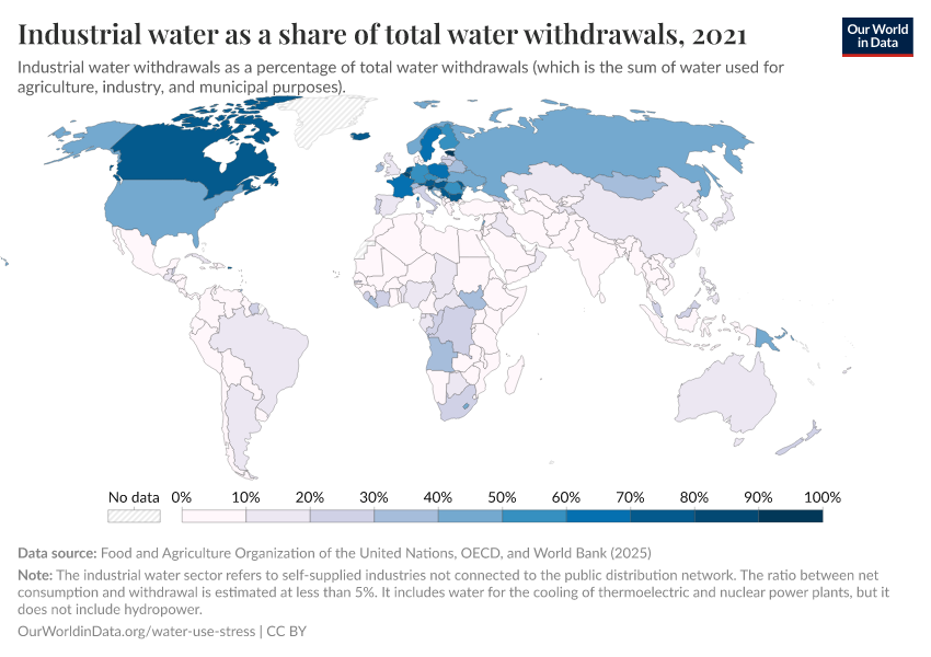 The visualization provides an overview of industrial water withdrawals measured as the share of total water withdrawals (which is the sum of agricultural, industrial, and domestic uses).