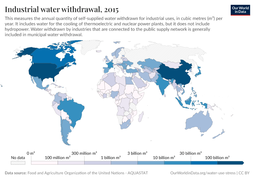 Industrial water withdrawal: "Annual quantity of self-supplied water withdrawn for industrial uses. It can include water from primary renewable and secondary freshwater resources, as well as water from over-abstraction of renewable groundwater or withdrawal from fossil groundwater, direct use of agricultural drainage water, direct use of (treated) wastewater, and desalinated water. This sector refers to self-supplied industries not connected to the public distribution network. The ratio between net consumption and withdrawal is estimated at less than 5%. It includes water for the cooling of thermoelectric and nuclear power plants, but it does not include hydropower. Water withdrawn by industries that are connected to the public supply network is generally included in municipal water withdrawal."