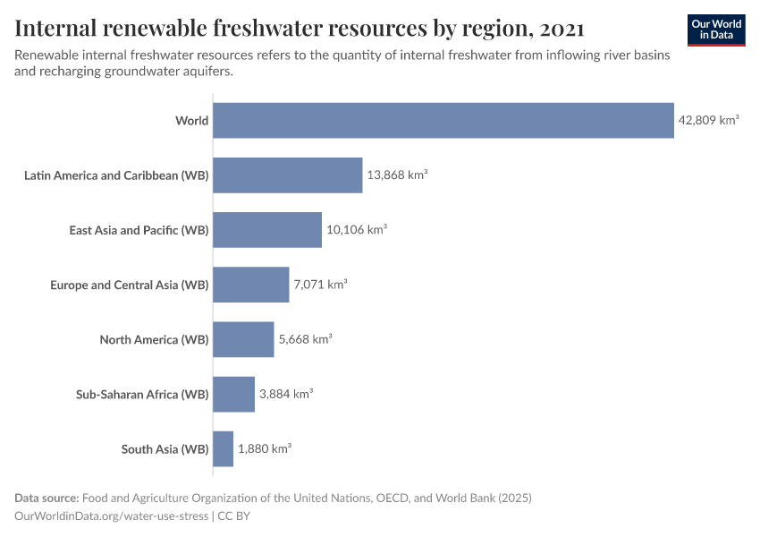 Renewable internal flows are, therefore, an important indicator of water security or scarcity. If rates of freshwater withdrawal begin to exceed the renewable flows, resources begin to decline. The chart shows the level of renewable internal freshwater resources per capita.