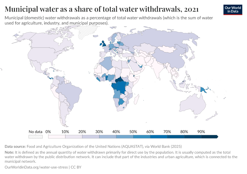 Municipal uses as a share of total water withdrawals across the world are shown in the chart. The majority of countries use less than 30 percent of withdrawals for domestic purposes.