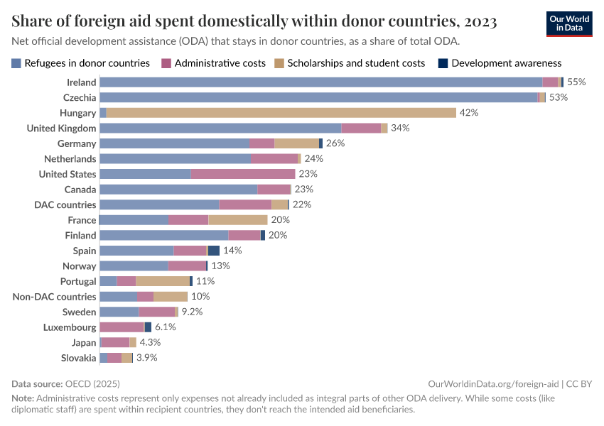 Another element that may be surprising is student scholarships — these can count as aid when they align with the host country's development plans.12 For most countries, this contribution is very small. But there are a few exceptions. Hungary is the most extreme case: it uses 41% of its aid budget for foreign students. In addition to refugee support and scholarships, aid money spent domestically includes funding for development awareness programs and administrative costs not already incorporated into specific aid initiatives.
