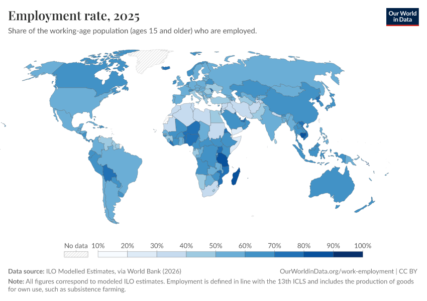 We focus on paid work among people of working age. Other important aspects, such as unpaid care work, child labor, and long-run trends in working hours, are covered separately.