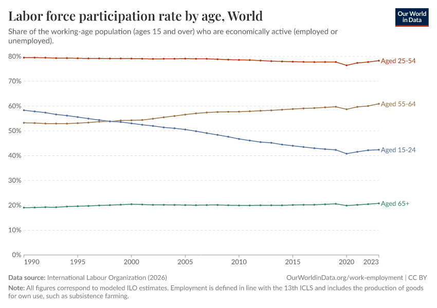For international comparisons, the most widely used cross-country series are produced by the International Labour Organization (ILO). In its harmonized series, the working-age population is typically defined as everyone aged 15 and older, with no upper age limit, and most of our charts on this page follow this definition.2