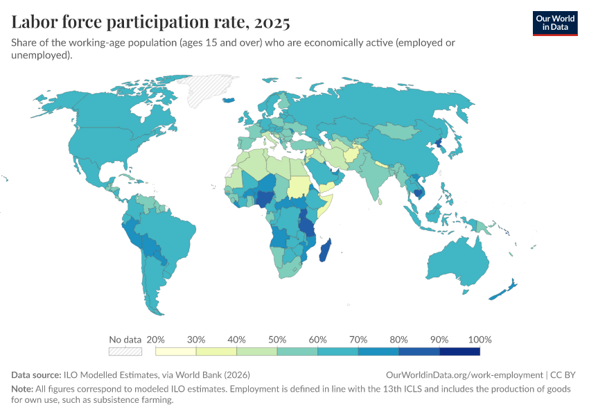The map shows labor force participation rates around the world. As we can see, there are large differences across countries — in some countries, more than 70% of adults are working or looking for work, while in others, fewer than half are active in the labor market.6