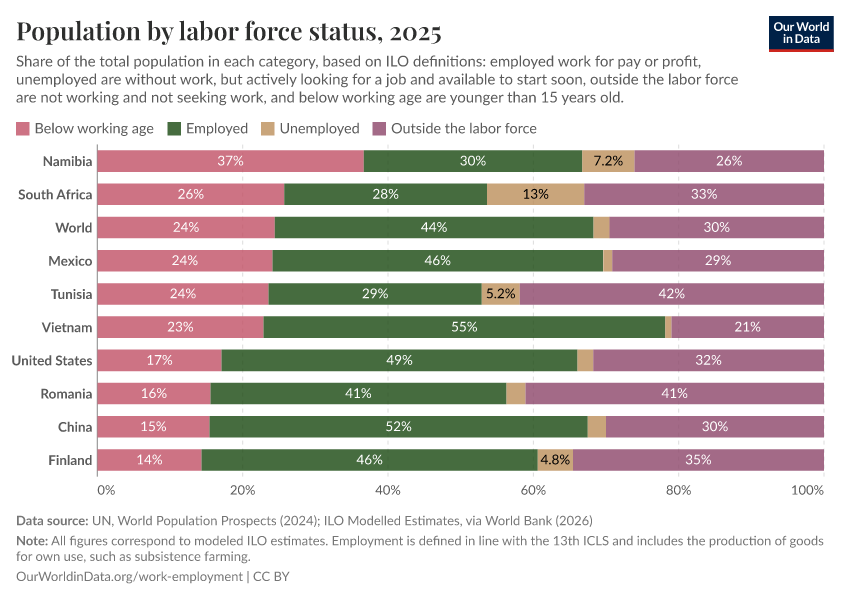 The exact definition of employment follows international standards that are set by the International Conference of Labour Statisticians (ICLS), and which have changed over time. We explain this further in How do international standards make labor data comparable?